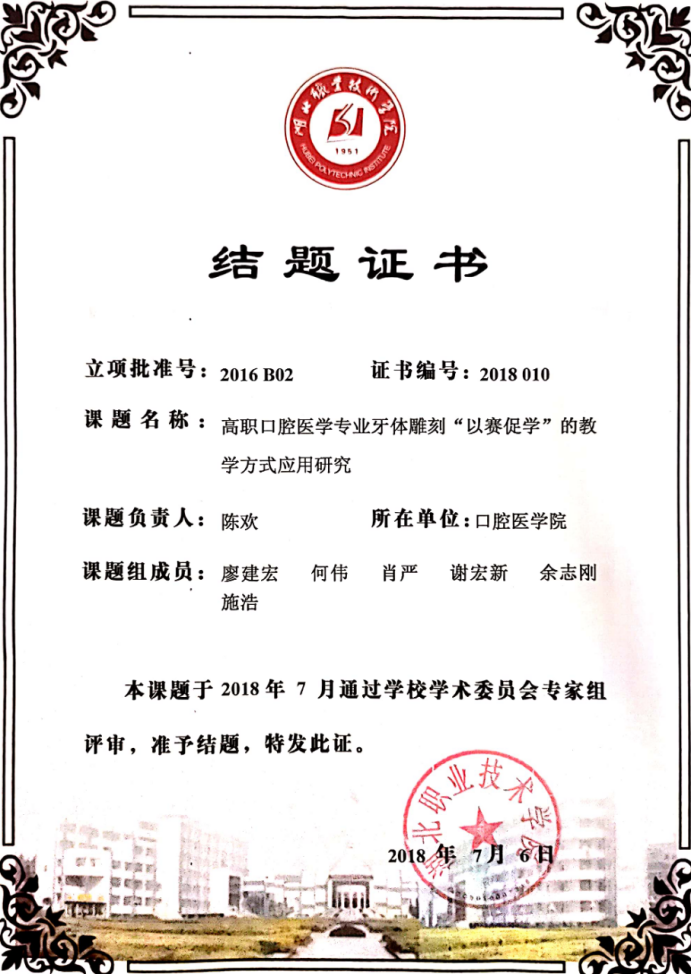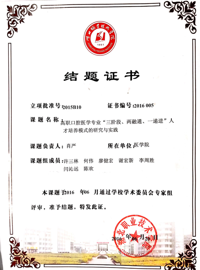 校级课题《高职口腔医学专业“三阶段、两融通、一递进”人才培养模式的研究与实践》结题证书