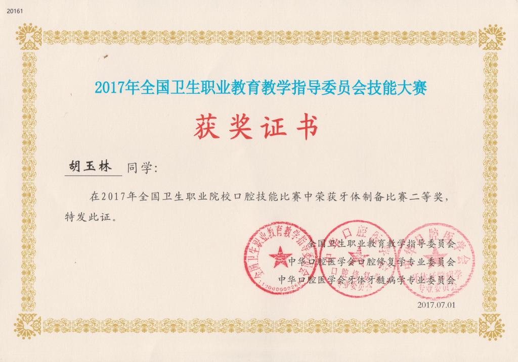 图5 胡玉林同学获2017年全国口腔技能技能大赛二等奖