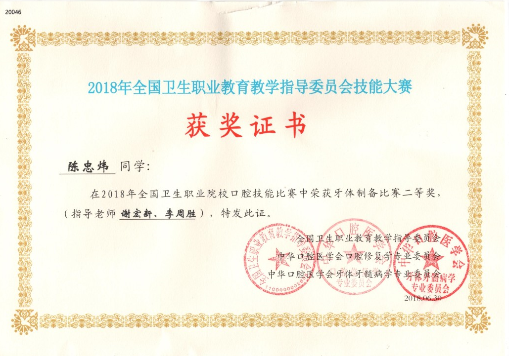 图6 陈忠炜同学获2018年全国口腔技能技能大赛二等奖