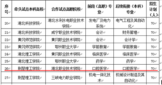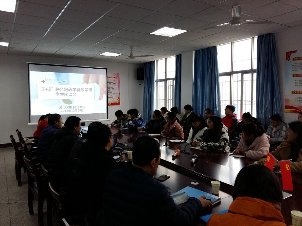 为贯彻落实《湖北省人民政府关于加快发展现代职业教育的决定》(鄂政发〔2014〕51号)的精神,经湖北省教育厅批准(鄂教高办〔2017〕1号及鄂教高办函〔2017〕3号文件),2017年我校与荆楚理工学院联合开展了口腔医学专业"3+2"一体化培养本科层次高素质技术技能型人才工作。2017年本项目严格执行招生要求,实际录取人数为70人,实际报到68人(其中1人入伍、1人未报到);2018年本项目录取70人(其中2人入伍)。“3+2”联合培养模式是本科院校转型发展和高等职业院校创新发展的共同需求、为高职学生成长和发展搭建了一座立交桥。