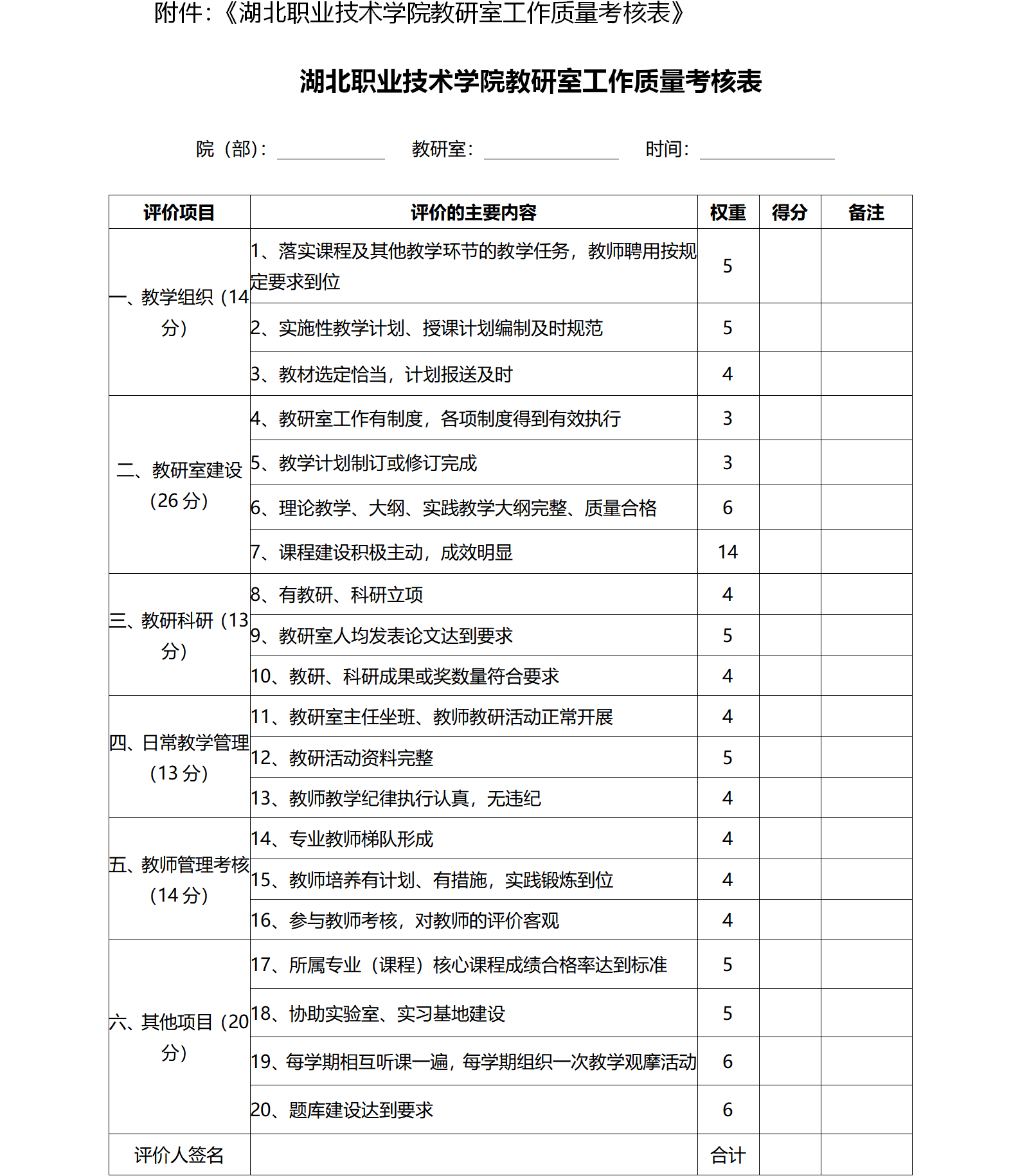 第十九条 教研室工作考核由学院组织进行,每学年一次,主要考核教研室工作任务完成情况。考核结果分优秀、良好、一般、较差四个等级。湖北职业技术学院教研室工作质量考核表见附件一。