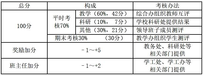 考核办法:除参加教师考核外,还要参加由教务处和本教学单位组织的考核(考核细则由教务处制定)。先由个人述职(交述职报告),然后参加考核拟定等次。