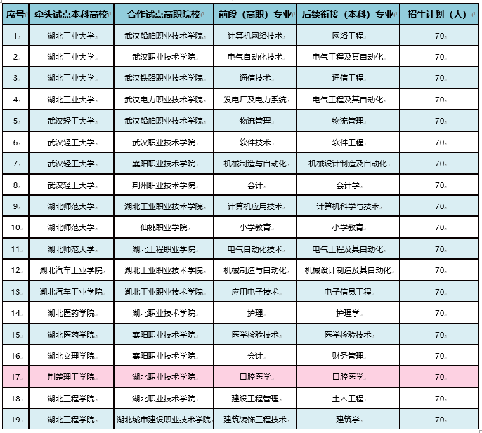 2017年度湖北省普通本科高校与高职院校联合培养技术技能型人才试点项目名单