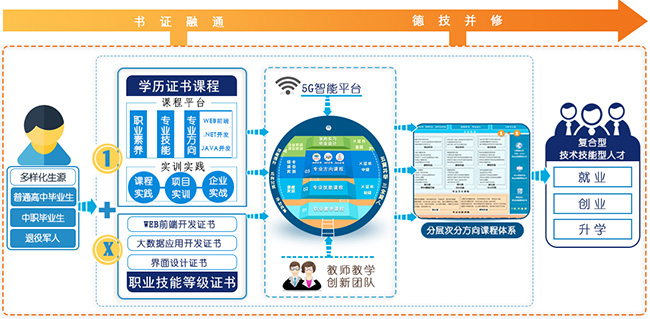 通过“学课程、练技能、考证书”三线的融合融通;实现了专业基础课、专业方向课程的逐层深入;课程实践、项目实训、企业实战的层层递进;初级、中级和高级认证的层层提升。通过分层分类培养,深化了软件技术专业复合型技术技能人才的培养,体现了鲜明的专业建设特色。