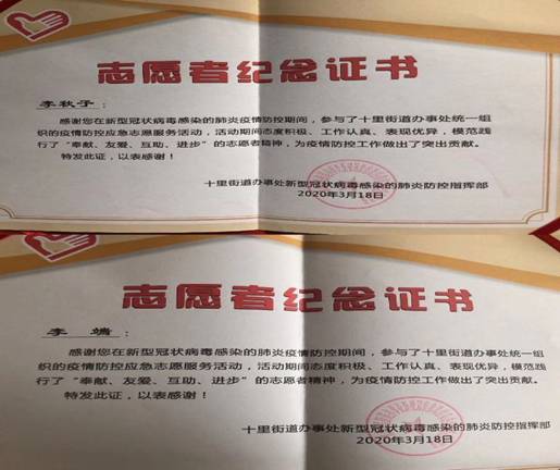 2020年春节期间,一场突如其来的疫情,引起了全国人民的高度关注。我院师生积极参与当地的志愿服务活动,为抗疫工作做出了贡献。其中,18级康复治疗技术专业的李秋子同学,与父亲(李靖)并肩抗疫,被传为佳话。